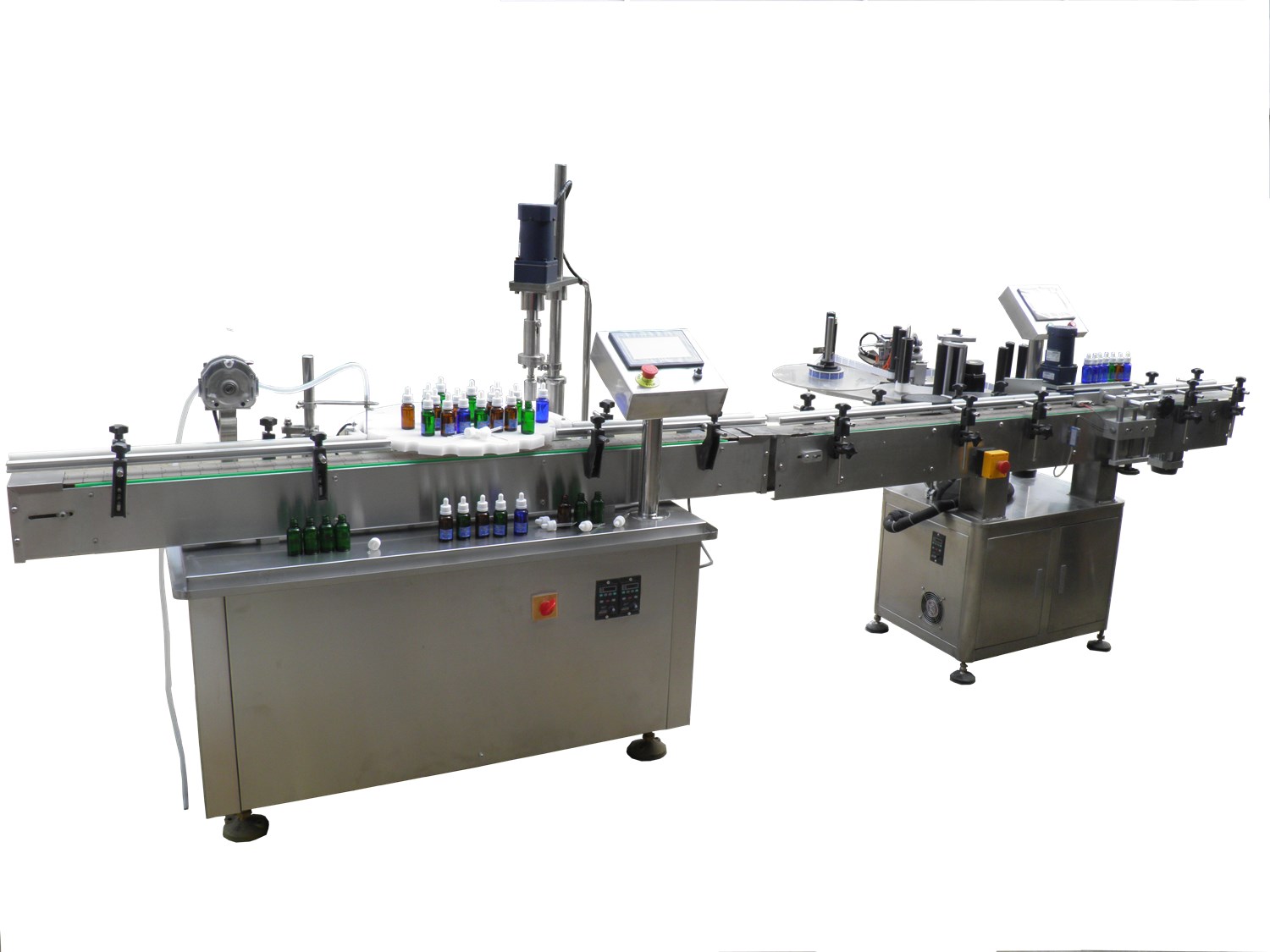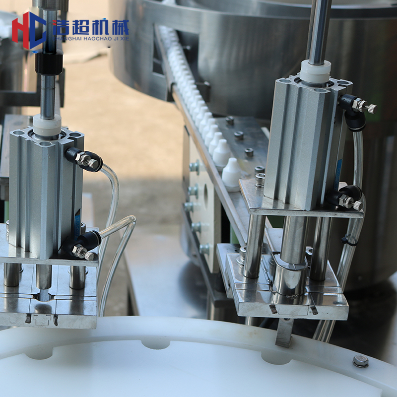 本机适用于2-30ML各种材质的圆形扁形塑料或玻璃瓶的精油灌装.本机由凸轮分度机构提供分度等分盘定位上塞上盖;加速度凸轮传动提供旋盖头的升降;恒扭矩旋盖;蠕动泵计量灌装;触摸屏控制.无瓶不灌装,不加内塞,外盖.具定位准确,传动平稳,保护瓶盖,计量准确.操作简单等优点。
