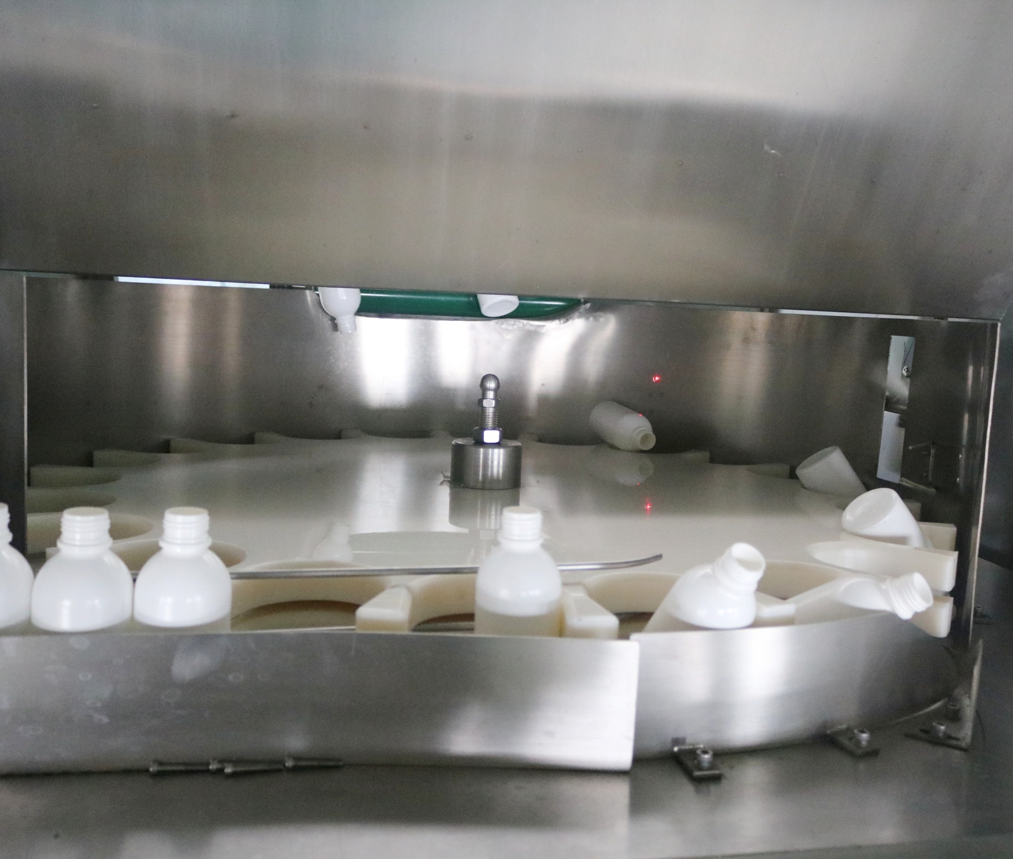 旋转花盘会将瓶子扶正并且有序的送入传送带